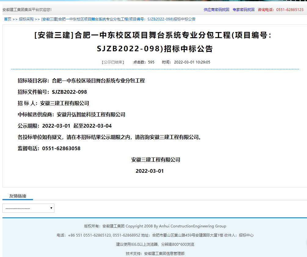 近日,安徽升弘智能科技工程有限公司成功中標合肥一中東校區項目舞臺系統專業分包工程項目,憑借自身在智慧校園建設與運營服務領域的技術實力和施工經驗,為合肥市文教衛系統開展業務工作提供有力保障。