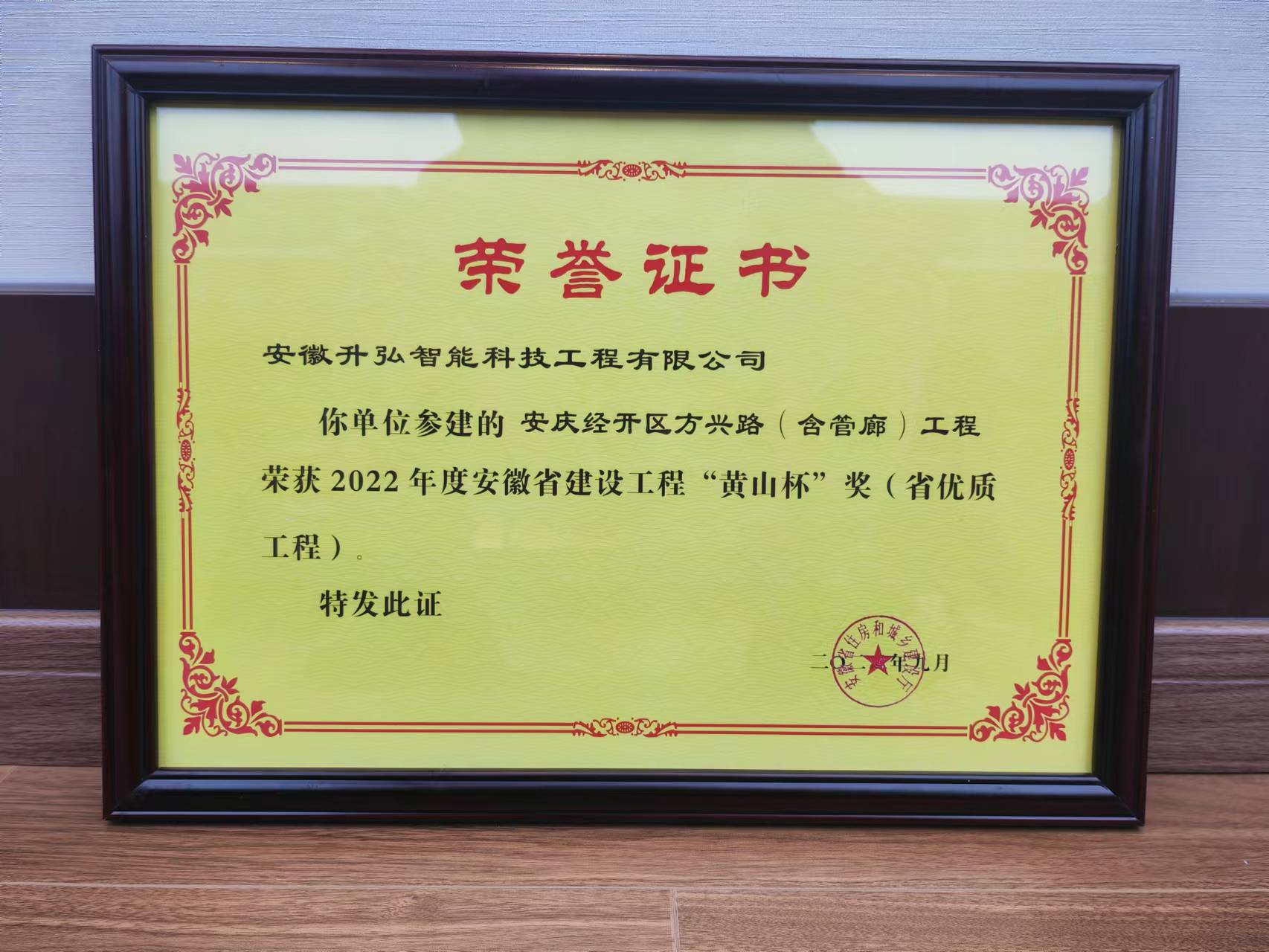 近日,集團公司子公司安徽升弘智能科技工程有限公司參建的安慶市經開區方興路(含管廊)工程榮獲2022年度安徽省建設工程“黃山杯”獎(省優質工程)。