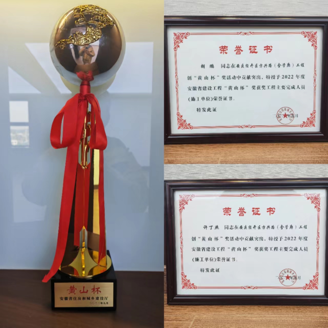 此外,升弘公司員工許丁照、胡鵬因在此次創獎活動中貢獻突出,被安徽省住房和城鄉建設廳特授予2022年度安徽省建設工程“黃山杯”獎獲獎工程主要完成人員(施工單位)榮譽證書。