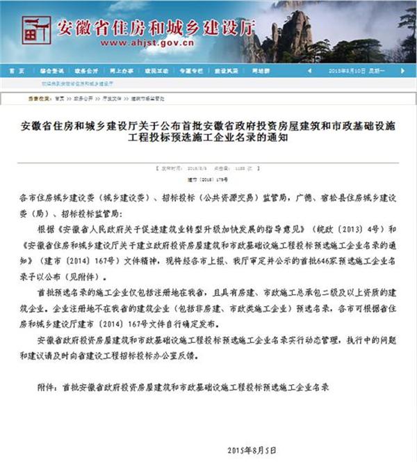 我公司入選首批安徽省政府投資房屋建筑和市政基礎設施工程投標預選施工企業名錄
