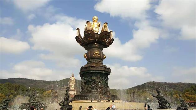 “身與云齊施法雨,目垂誨眾示深慈”,這是原中國佛教協會會長趙樸初《靈山大佛》中的一句詩詞。如果沒有去過靈山勝境,沒有依臥佛腳瞻仰佛容,或許很難感同身受。這座通高88米的純銅佛像,巍然站立,廣視眾生,右手指天,左手指地,顯現慈悲法相。其背倚小靈山,面朝太湖,左靠青龍山,右挽白虎山,暗合中國風水“左青龍、右白虎、前有照、后有靠”布局,從空中鳥瞰,整體走勢呈太師椅狀,整個勝境靈氣自八方而來,匯聚于山門照壁之上,是謂“八風吹不動,端坐紫金蓮”。