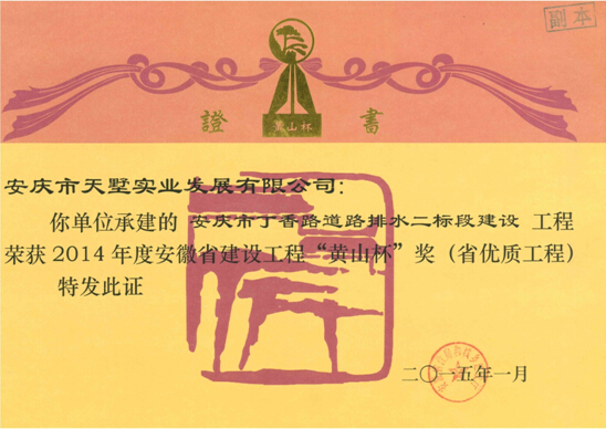 日前,由我公司承建的安慶市丁香路道路、排水二標段建設工程喜獲2014年度安徽省建設工程“黃山杯”獎(省優質工程),這也是我司繼振風大道、皖江大道等項目后再次斬獲的“黃山杯”獎項。